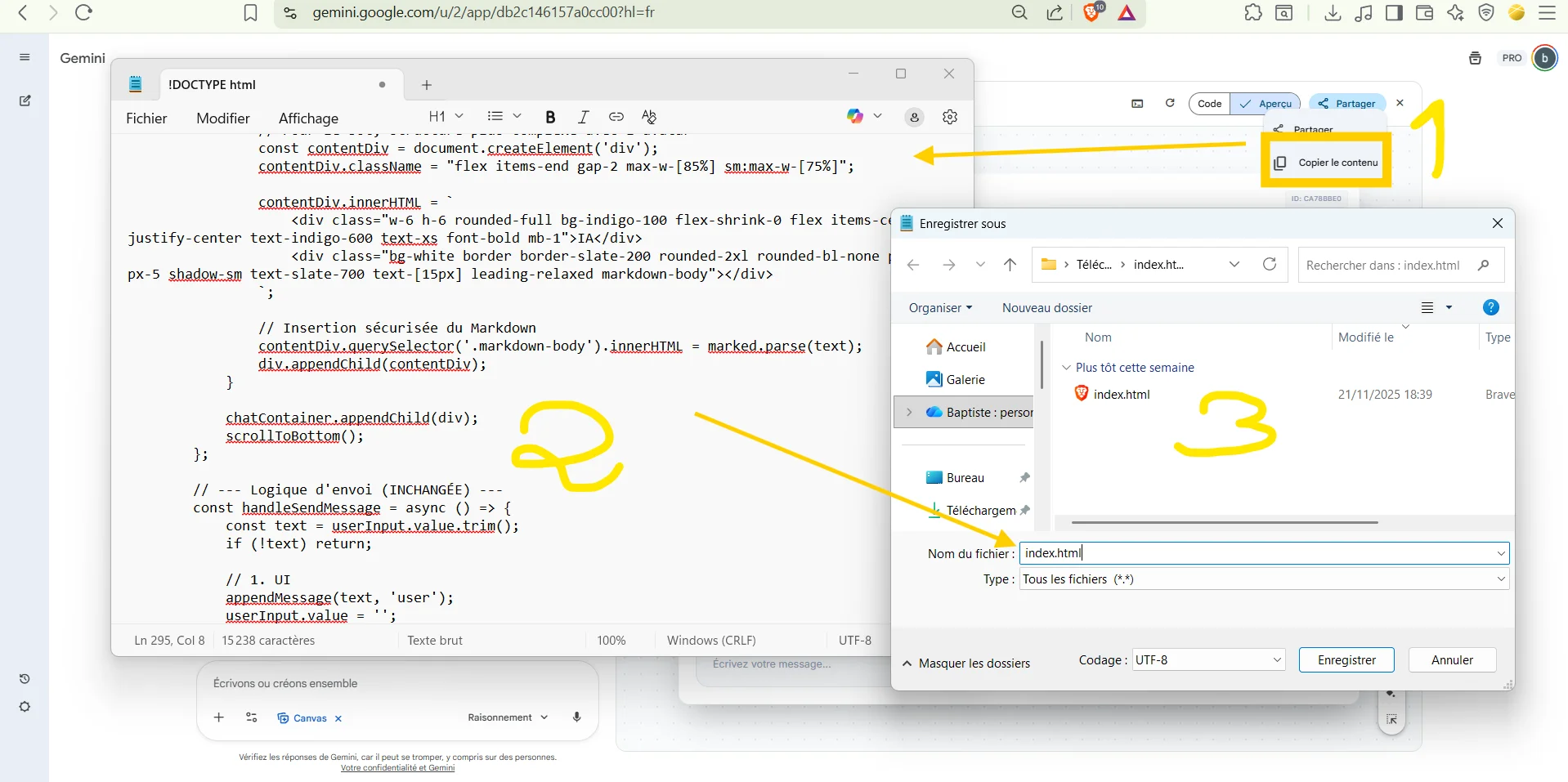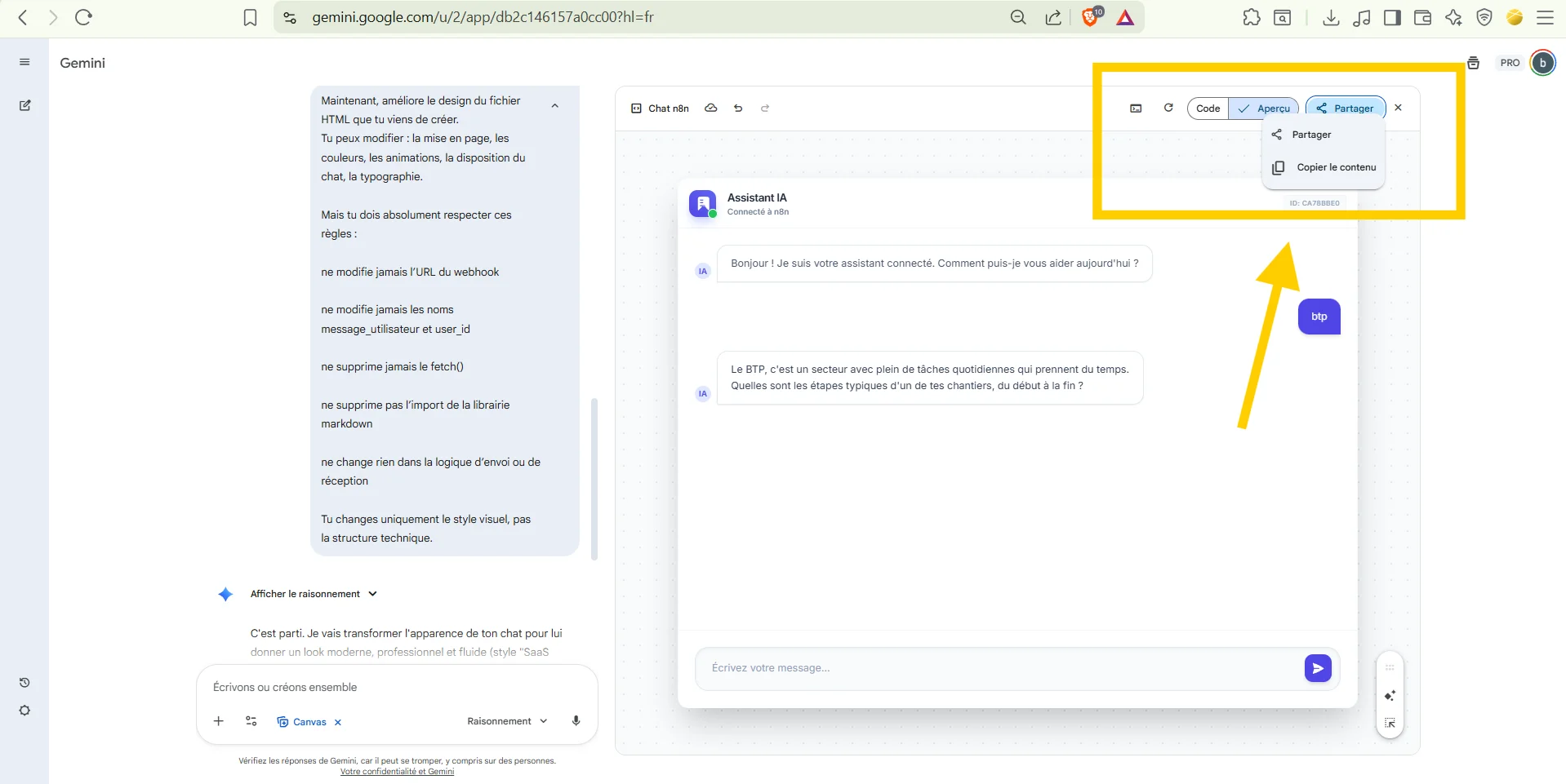 Dans Gemini, cliquez en haut à droite sur “Copier le code”.